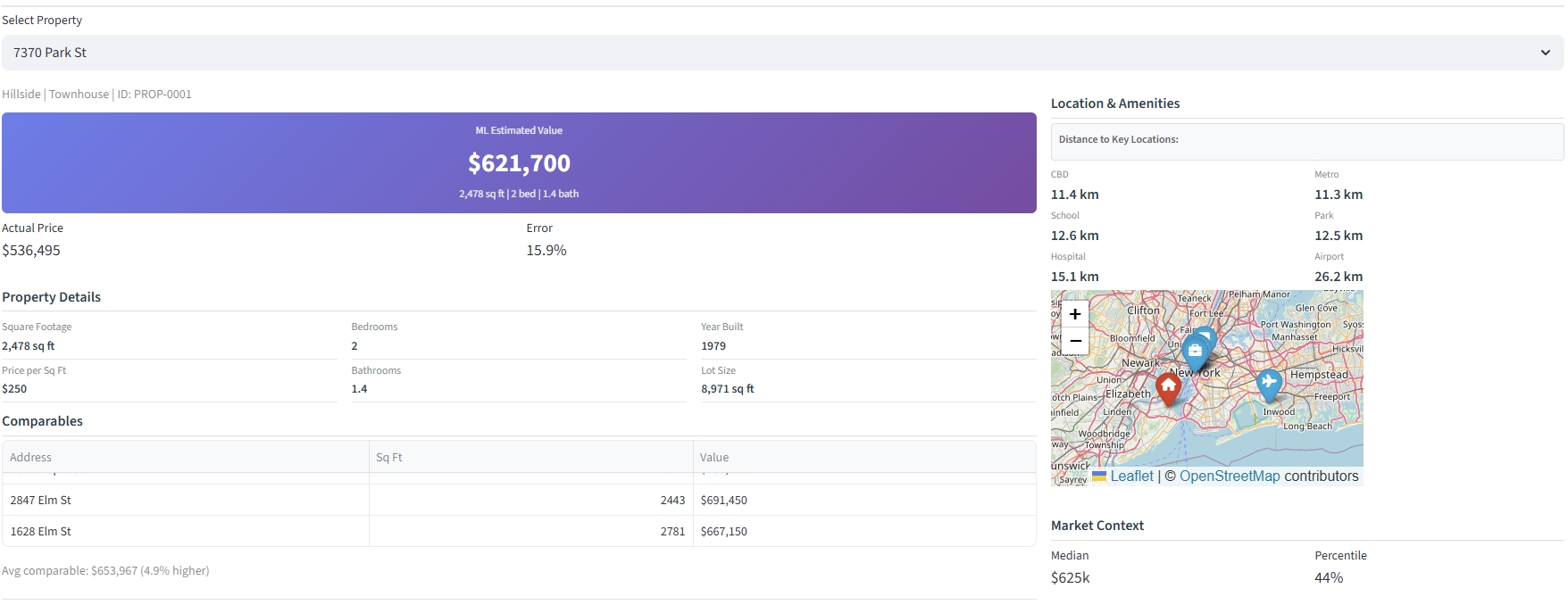 Figure 1: The complete dashboard integrates ML predictions with property details, comparable properties, distance to amenities, an interactive map, and market context metrics.