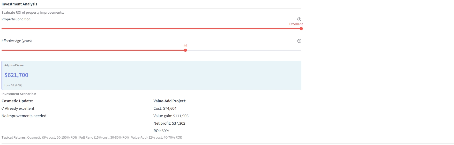 Beyond basic valuation, enable users to explore investment scenarios by adjusting controllable property factors. Real estate investors need to evaluate renovation potential and ROI before making acquisition decisions. Focus on factors investors can actually control: property condition through renovations and effective age through modernization.